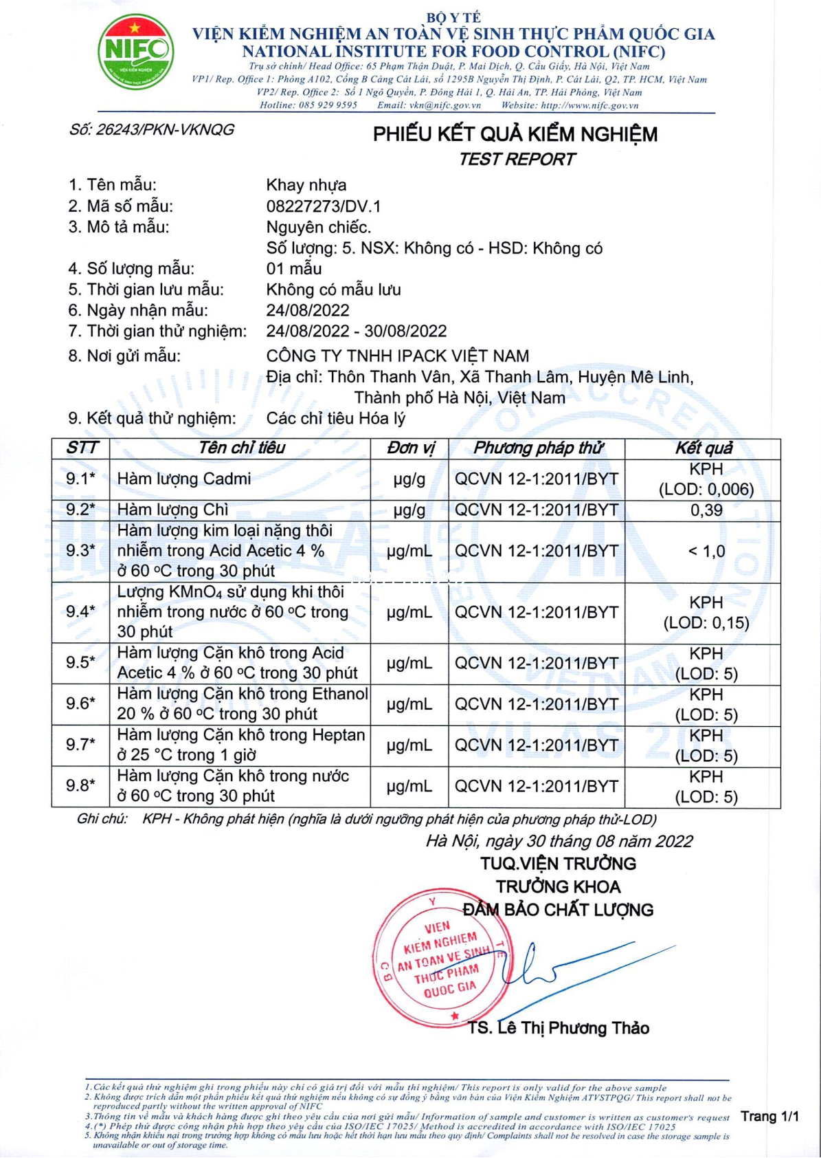 Chứng nhận kiểm nghiệm nhựa về Vệ sinh An Toàn Thực Phẩm